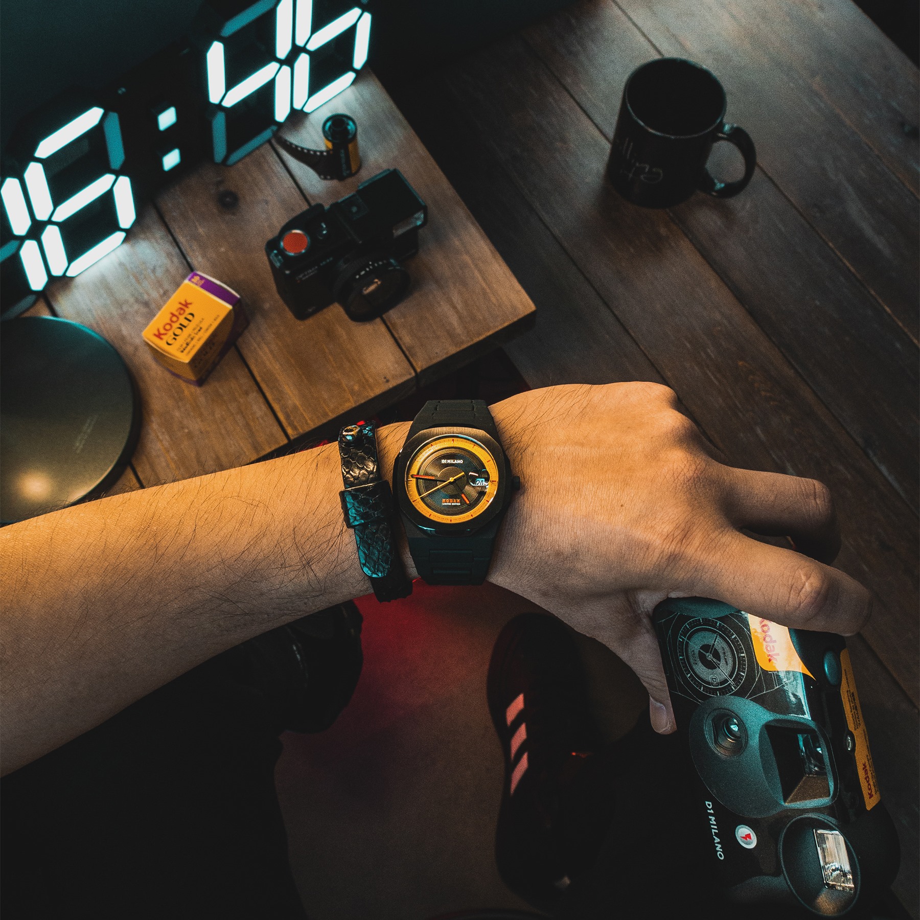 นาฬิกาดีไซน์แรกของแบรนด์ที่เปี่ยมไปด้วยเอกลักษณ์ และสร้างชื่อเสียงให้กับ D1 Milano อย่างรวดเร็ว วัสดุ Polycarbonate ที่ไม่มีใครเคยคาดคิดว่าจะถูกนำมาใช้กับนาฬิกาดีไซน์ แต่พวกเขาก็ลบภาพจำของพลาสติกแบบเดิม ๆ ด้วยการเคลือบผิวแบบ Soft-touch ทำให้ตัวเรือนมีสัมผัสที่นุ่มนวล ละมุนมือ และสวมใส่สบายอย่างเหลือเชื่อ
