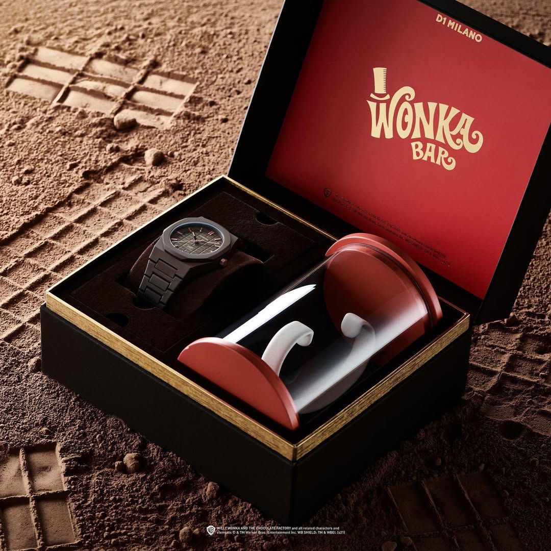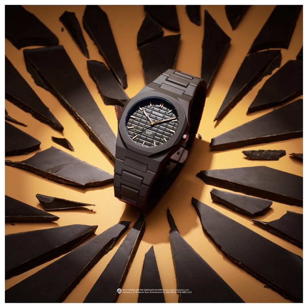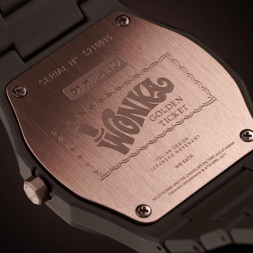 จุดเด่นที่โดดออกมาจากตัวเรือนคือเข็มวินาทีสีทอง ซึ่งเปรียบเสมือนการค้นพบ “ตั๋วทองคำ” (Golden Ticket) อันล้ำค่าที่ซ่อนอยู่ในห่อช็อกโกแลต เท่านั้นยังไม่พอ! ยังมี 300 เรือนพิเศษที่มีฝาหลังนาฬิกา PVD สีทองปะปนอยู่ในกล่องปกติ หากผู้โชคดีได้รับเคสสีทองด้านหลังจะได้รับของขวัญจำนวนจำกัดส่งตรงจาก D1 Milano ถือเป็นกิมมิกที่เล่นใหญ่แต่ได้เอนเกจไปเต็ม ๆ
