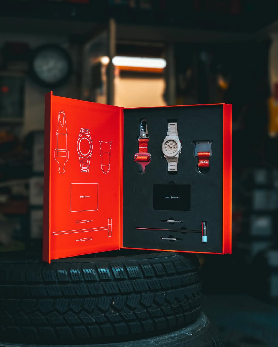 เลือกใช้นาฬิการุ่น Polychrono ขนาด 40.5 มม. (Polycarbon ที่มีหน้าปัดเล็กเพิ่มเข้ามา) พื้นผิวหน้าปัดสีเทาดีไซน์ลวดลายคล้ายกับพื้นถนนในกริด ตัดกับสีแดง Racing Red บนเข็มจับเวลาและปุ่มกด ซึ่งเป็นสีประจำทีม Prema ที่แฟนมอเตอร์สปอร์ตทั่วโลกจดจำได้ทันที ภายในกล่องยังมีพวงกุญแจคัสตอมและเครื่องมือปรับสายนาฬิกาที่ได้รับแรงใจการเข้า Pit Stop ของรถแข่ง เรียกได้ว่าจัดเต็มทุกดีเทล